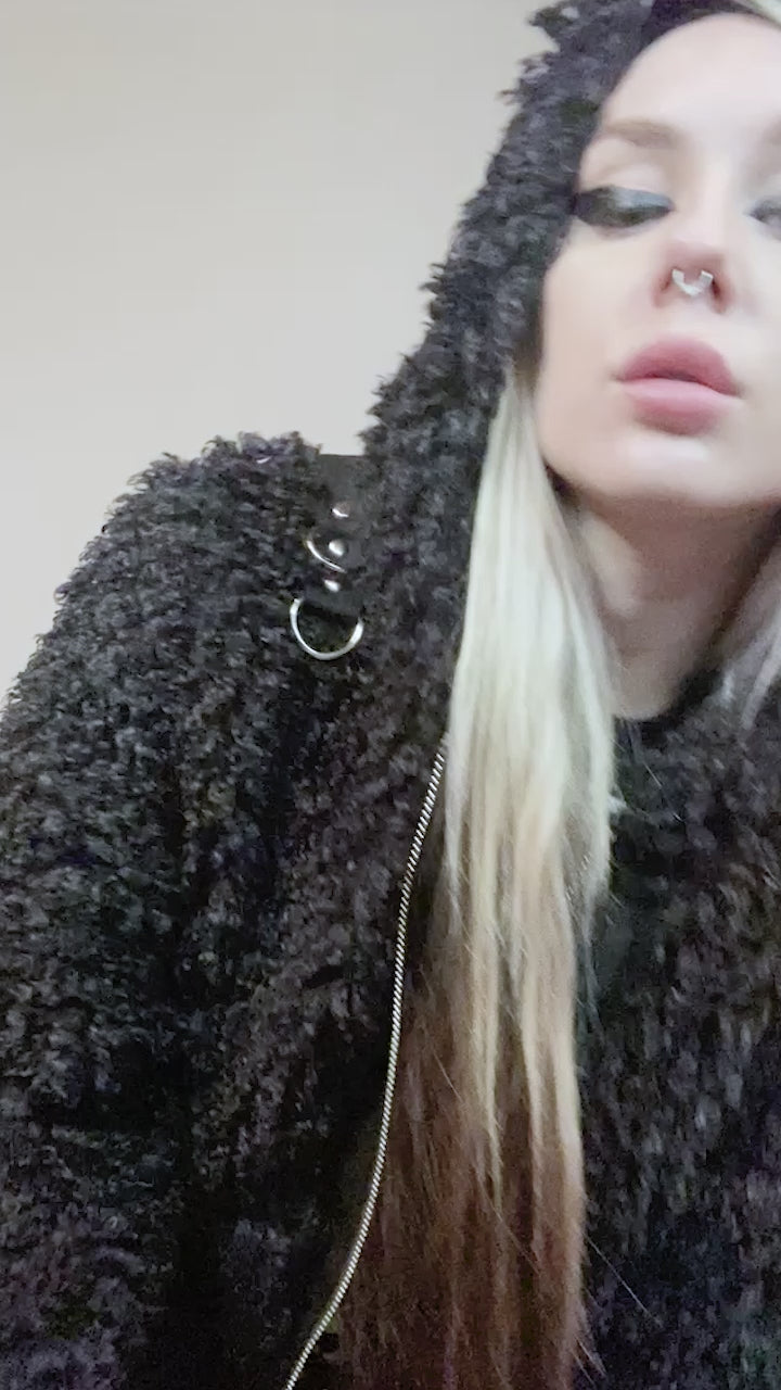 Another Lip Service classic reimagined! Made of black faux fur and lined with our skull and cross bones print, this jacket is actually functionally warm. iGirl cross hairs logo patch and bondage straps on the back. Hood zips flat. She's gonna make you bleed!