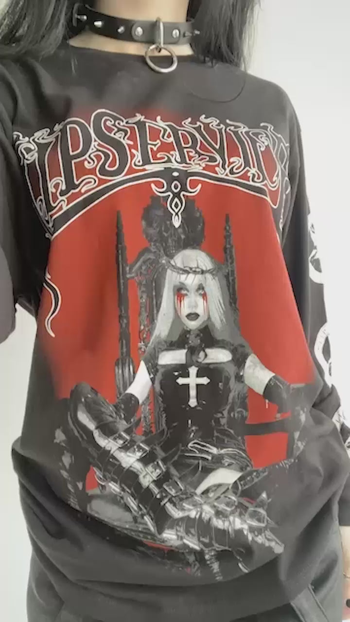 We love this vintage Lip Service logo so much we brought it back from the dead. The shirt features Nikiski Noir on her black throne of agony staring daggers into your heart. FROM LIFE UNTO DEATH on the back, Riddick dagger on one sleeve and three pentagrams on the other. BLACK METAL AF.
