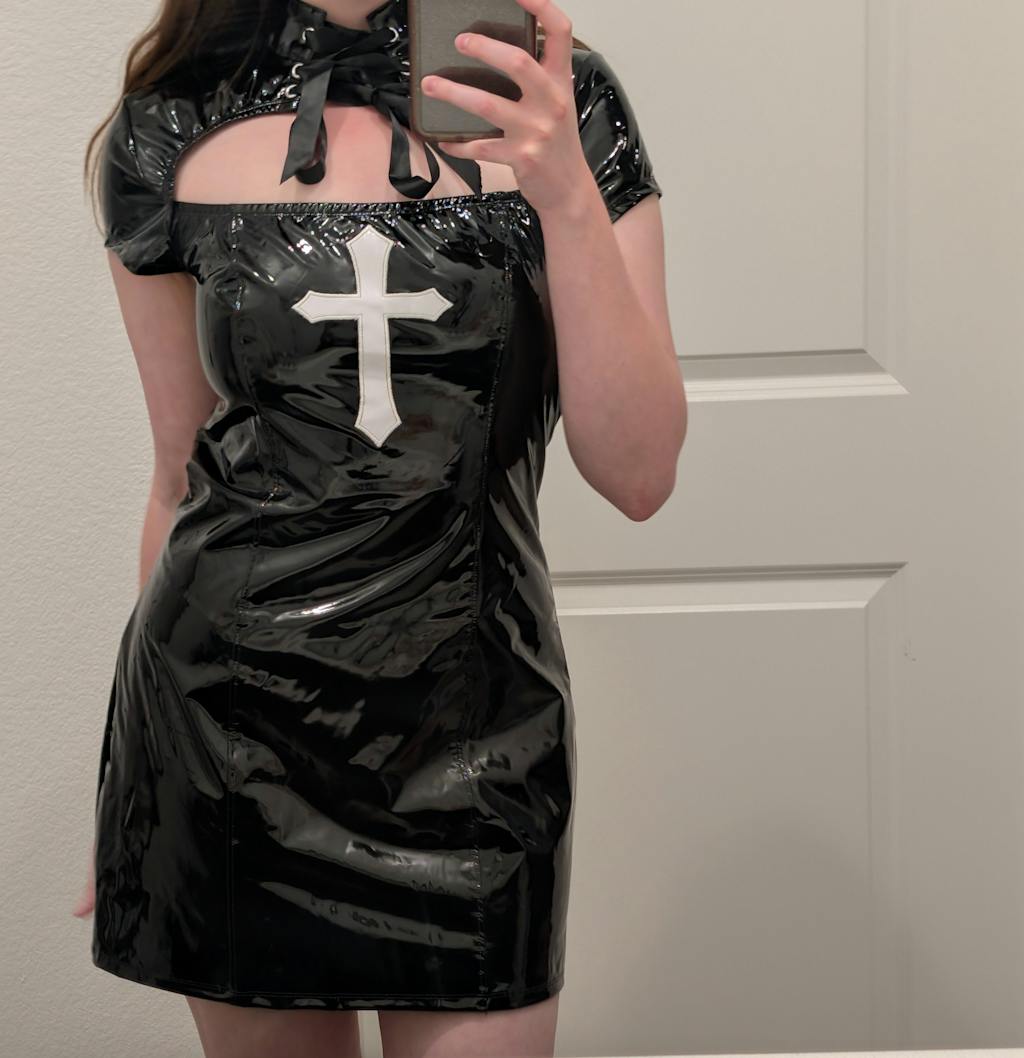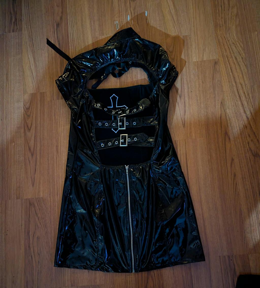 Another classic resurrected!!! The Black Vinyl Houses of the Holy Wicked Sinner Cross Dress is here! Whether you are delivering a sermon to your disciples or taking the holy sacrament this dress will deliver you from evil. The power of Christ compels you...to be WICKED!