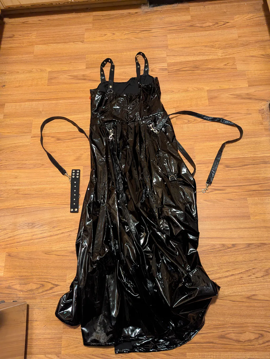 Lip Service Classic Black PVC VINYL INDUSTRY Ball gown. Vegan Bondage wristbands included. Adjustable vegan leather straps at the waist and shoulders to get that fit just right. Clips on the hips and D-rings to hike up the skirt to your liking. Goth Prom here we come! Size chart in inches.
