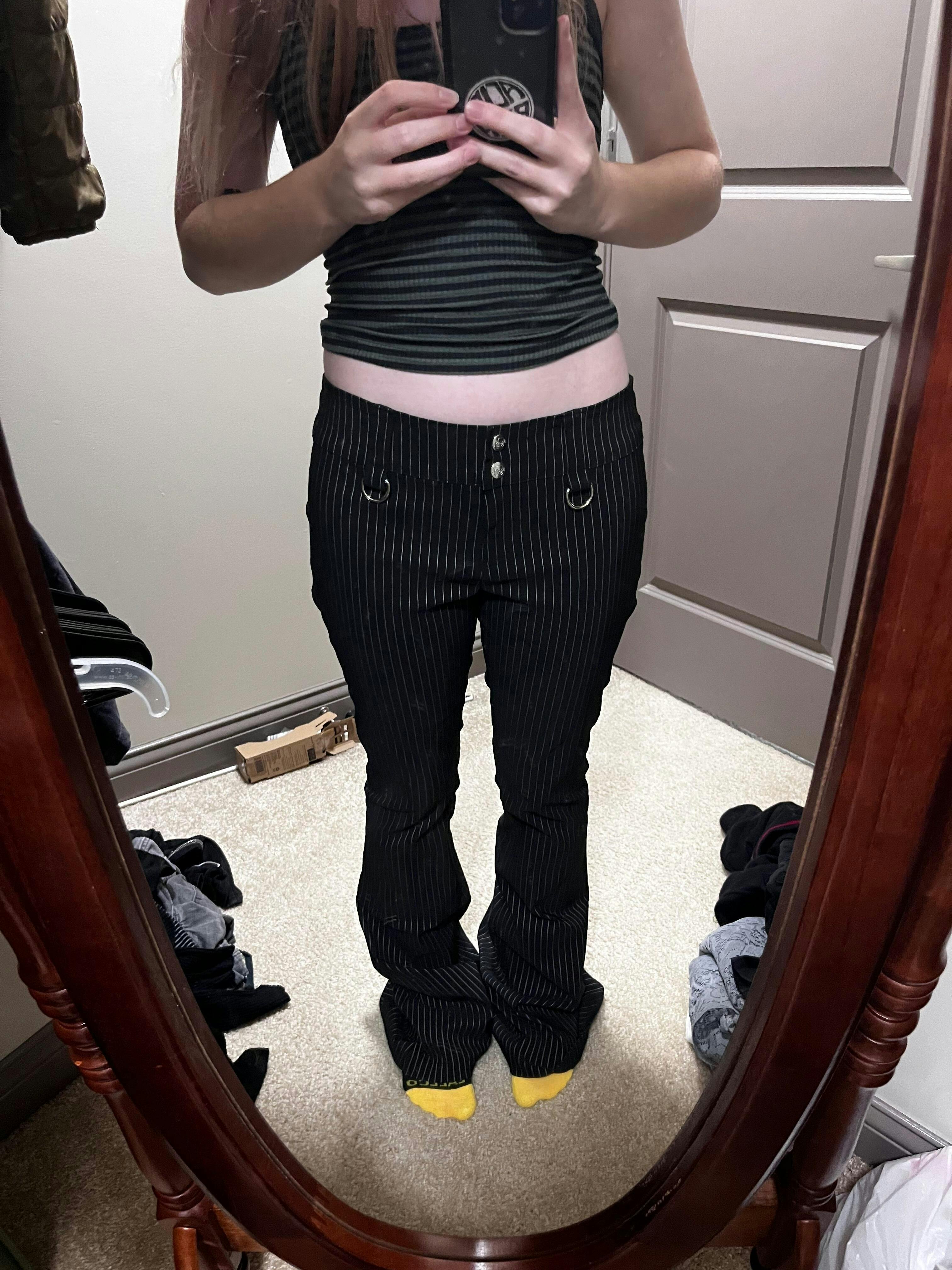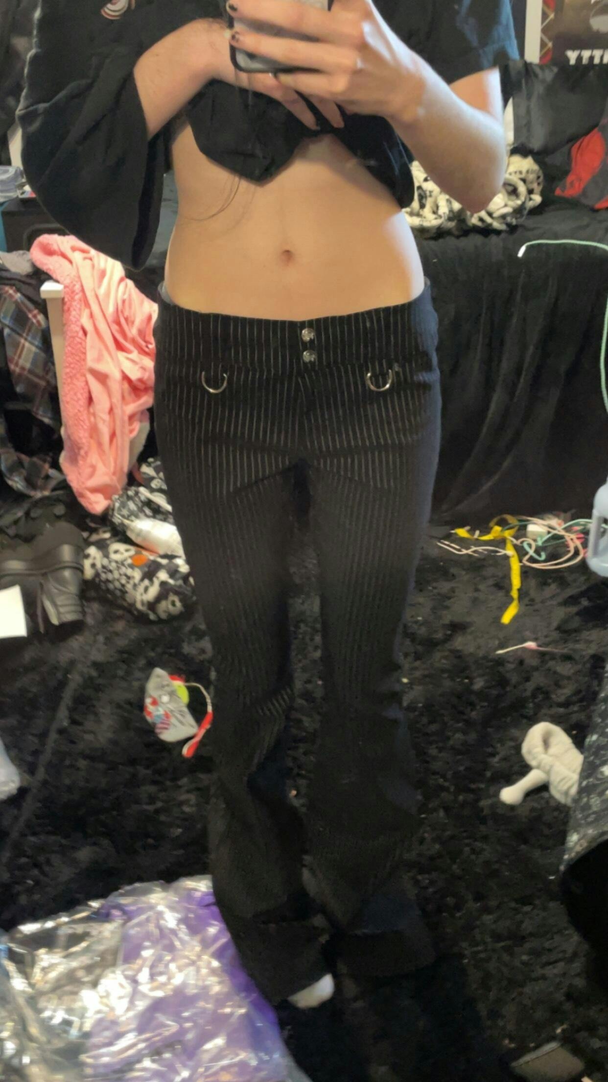 Pinstriped Gangsta Pranksta Karley Pants! The 90's called and they wanted their pants back so we made them. Black, low waisted boot cut with with a thin white pinstripe, because you fancy. They're nice and stretchy too! D-ring details on the front and back. Double button snap waist closure and zipper fly.