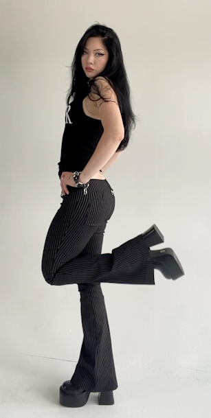 Pinstriped Gangsta Pranksta Karley Pants! The 90's called and they wanted their pants back so we made them. Black, low waisted boot cut with with a thin white pinstripe, because you fancy. They're nice and stretchy too! D-ring details on the front and back. Double button snap waist closure and zipper fly.